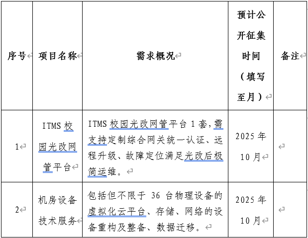为便于供应商及时了解企业采购信息,现将河南物联网技术有限公司2025年10月企业采购意向公开如下: